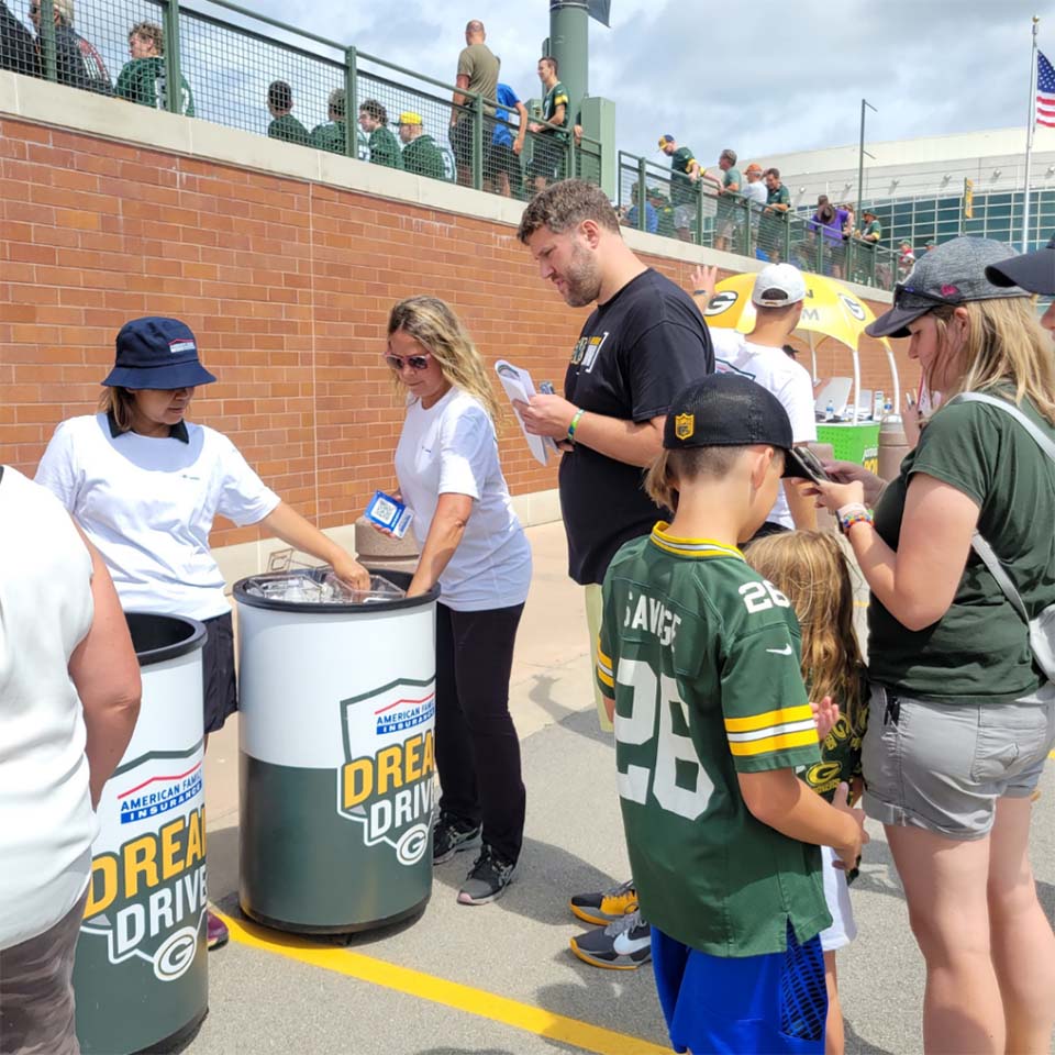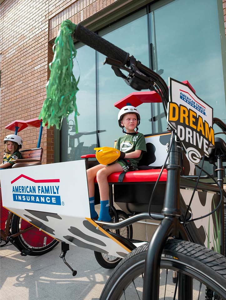 For the 12th anniversary of the American Family Insurance DreamDrive, we were proud to build the five custom “Dream Fleet” bikes that highlight this beloved Packers tradition. Each summer, players ride children’s bikes to and from practice, creating meaningful connections with young fans. The Dream Fleet adds a special touch: five uniquely designed bikes that showcase Wisconsin pride and the AmFam/Packers partnership in style. Selected kids get the once-in-a-lifetime chance to ride alongside players on these bikes and receive a co-branded helmet we graphiced, autographed by their partner, making DreamDrive a true highlight of Packers training camp.